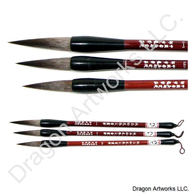 A set of three Chinese calligraphy brushes with bear hair bristles and beautiful wood handles. The handles of these bear hair bristle Chinese calligraphy brushes are engraved with Chinese characters. Bear hair bristles are a little stiffer than wolf hair and therefore easy to control, while also holding a point very nicely.